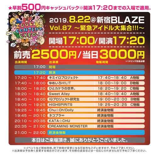 IDOL CONTENT EXPO @ 新宿BLAZE Vol.87~緊急アイドル大集合!!!~ by 笹木里緒菜生誕実行委員2020、2019年8月23日2020年5月27日 会場:新宿BLAZE 時間:開場17:00/開演17:20